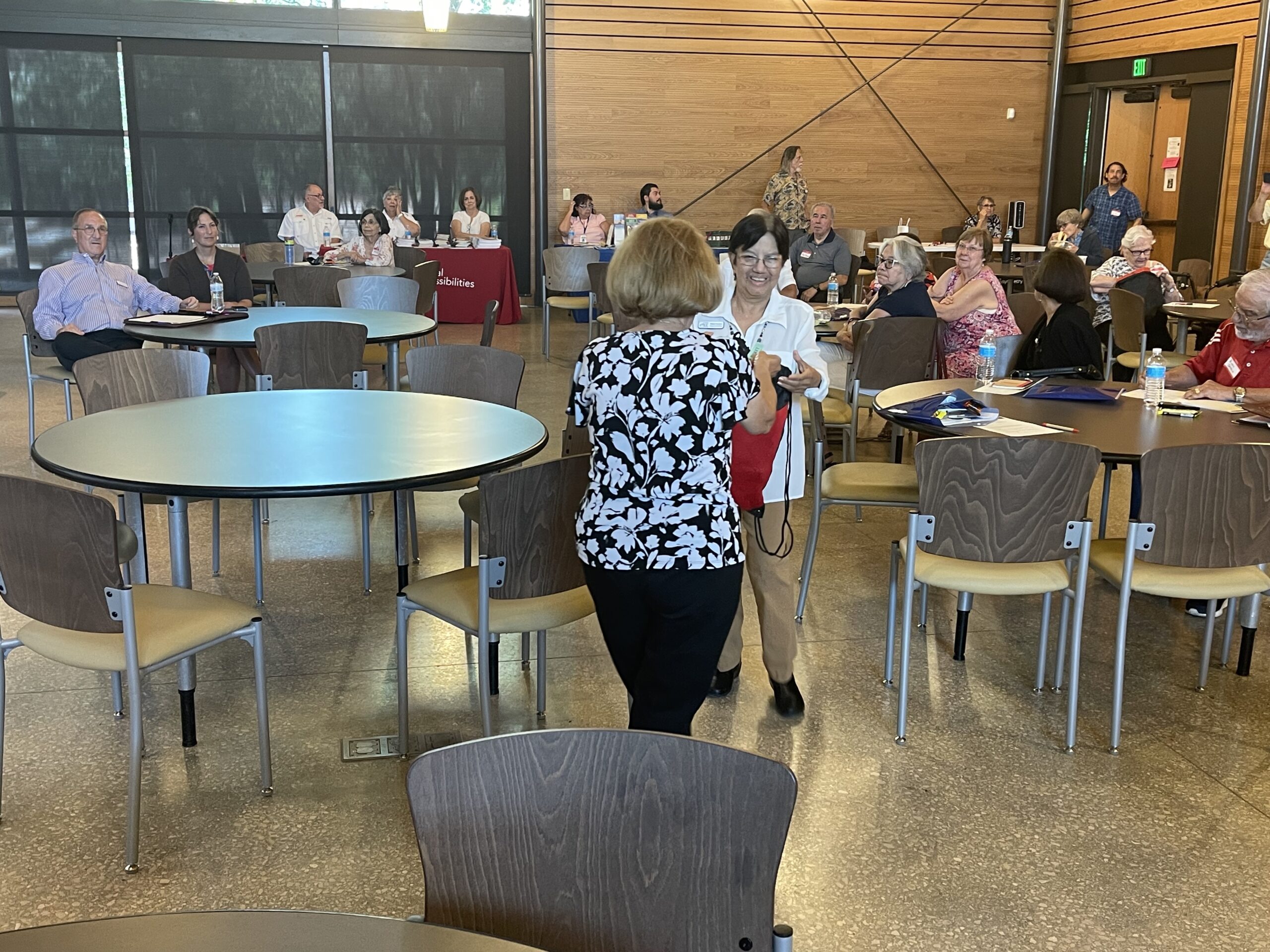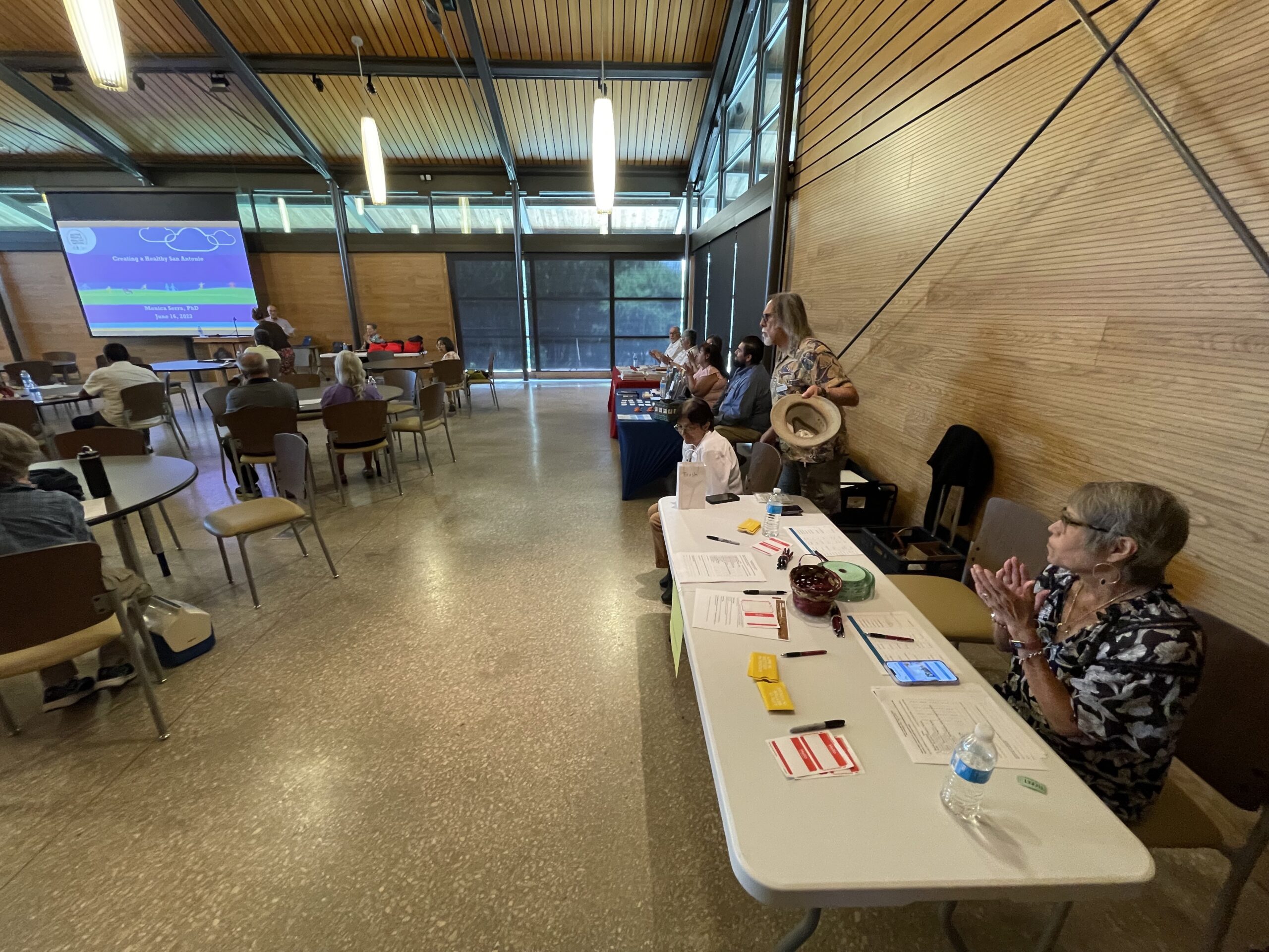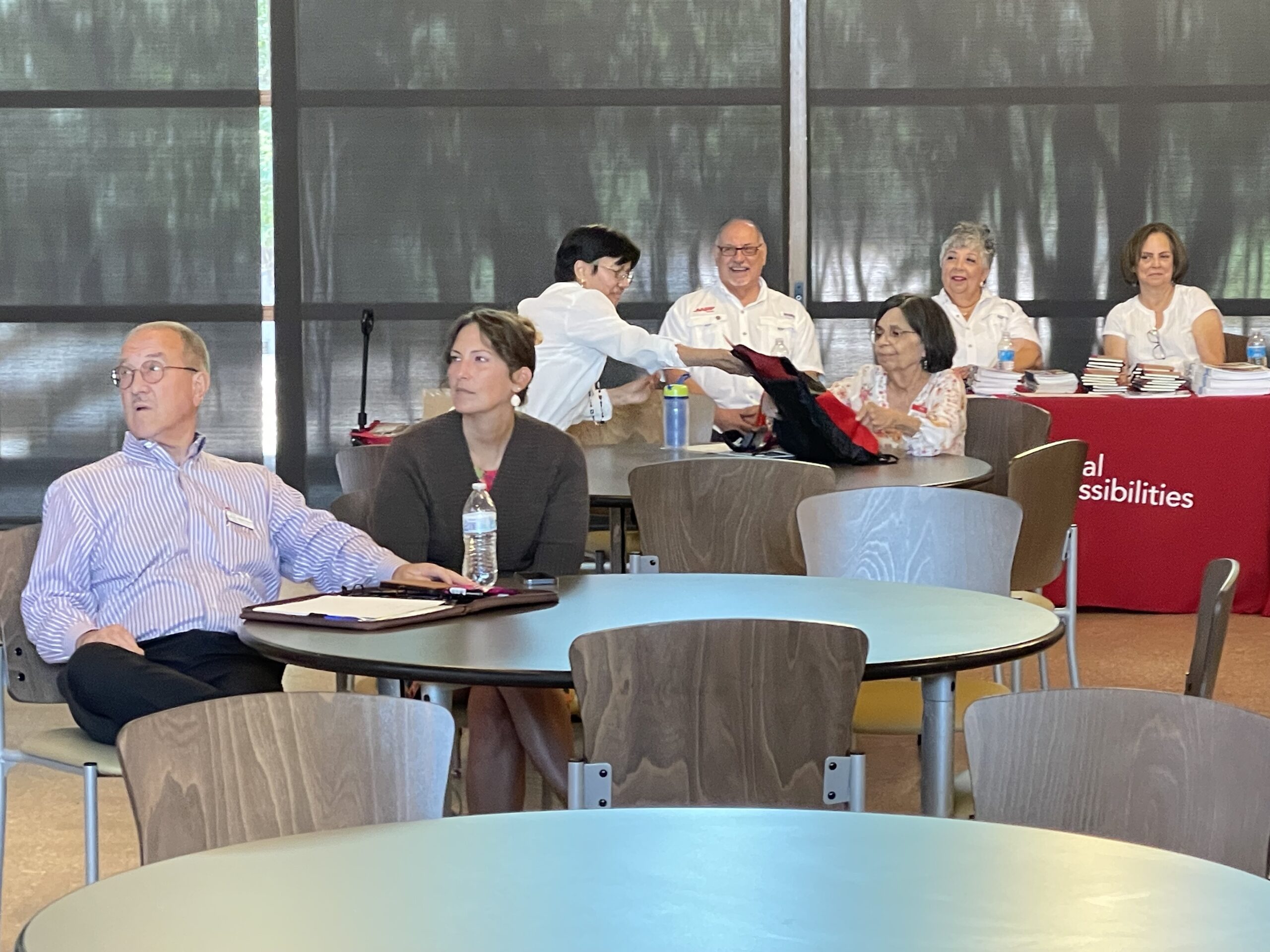 Diana Alcocer, RECOSA board member, hands door prize to audience member
