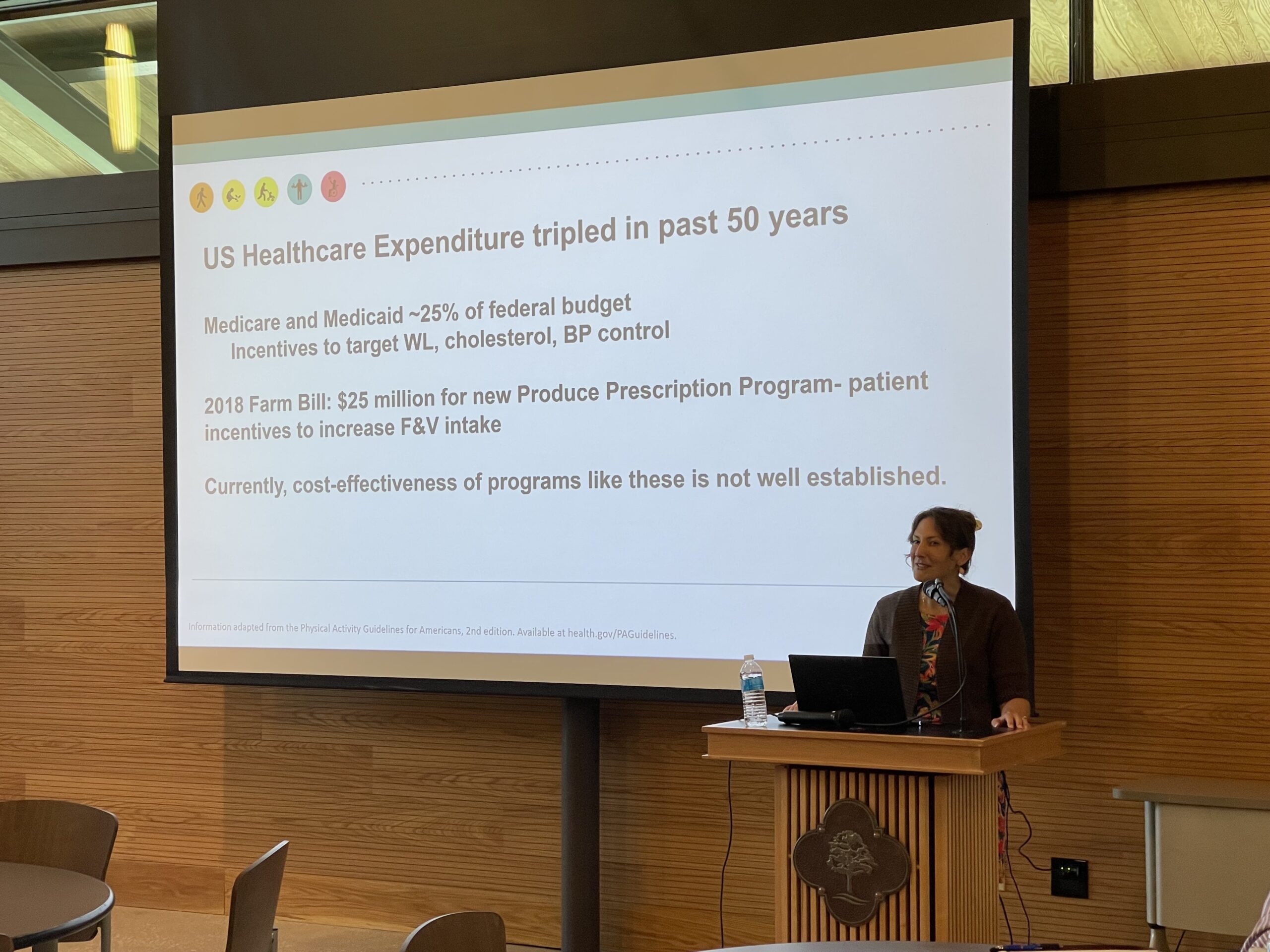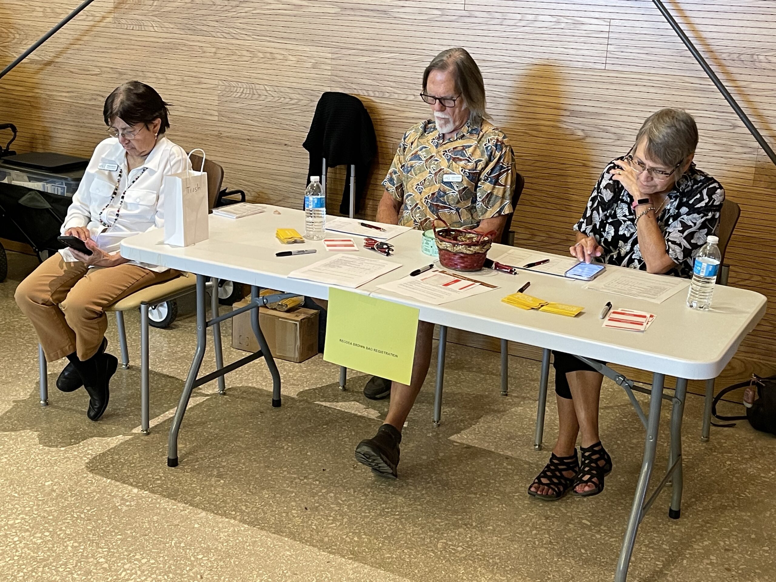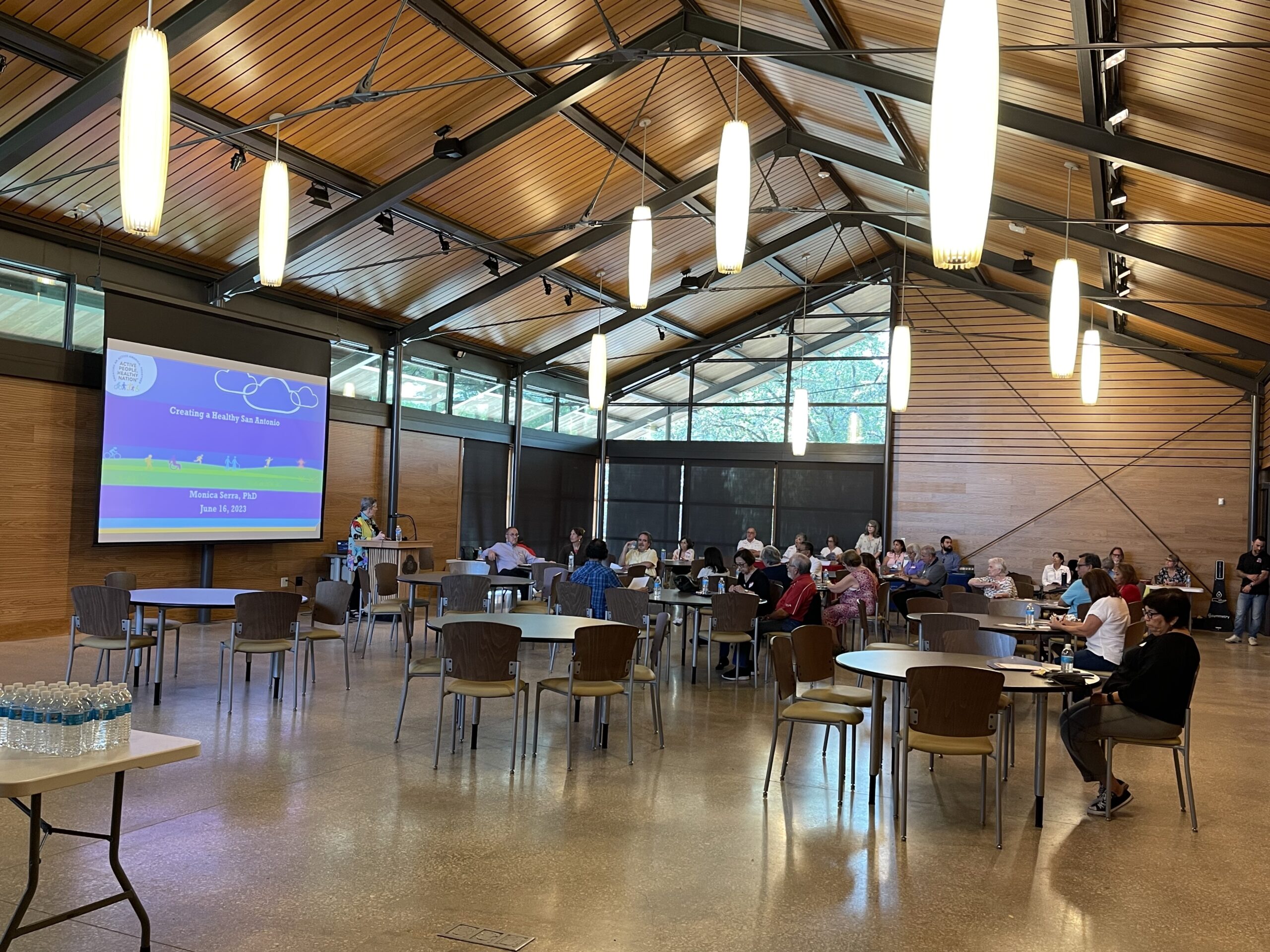 Diana Alcocer, RECOSA board member, hands door prize to audience member