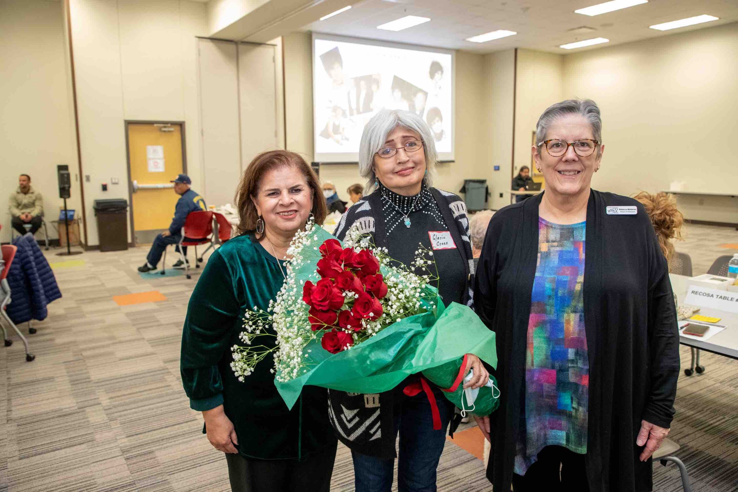 Liz Garcia (left) and Becky Waldman (right) present Gloria Green (center) with flowers in recognition of the contributions of Rose Rangel, former RECOSA chair and board member. Rose passed away in November 2021.