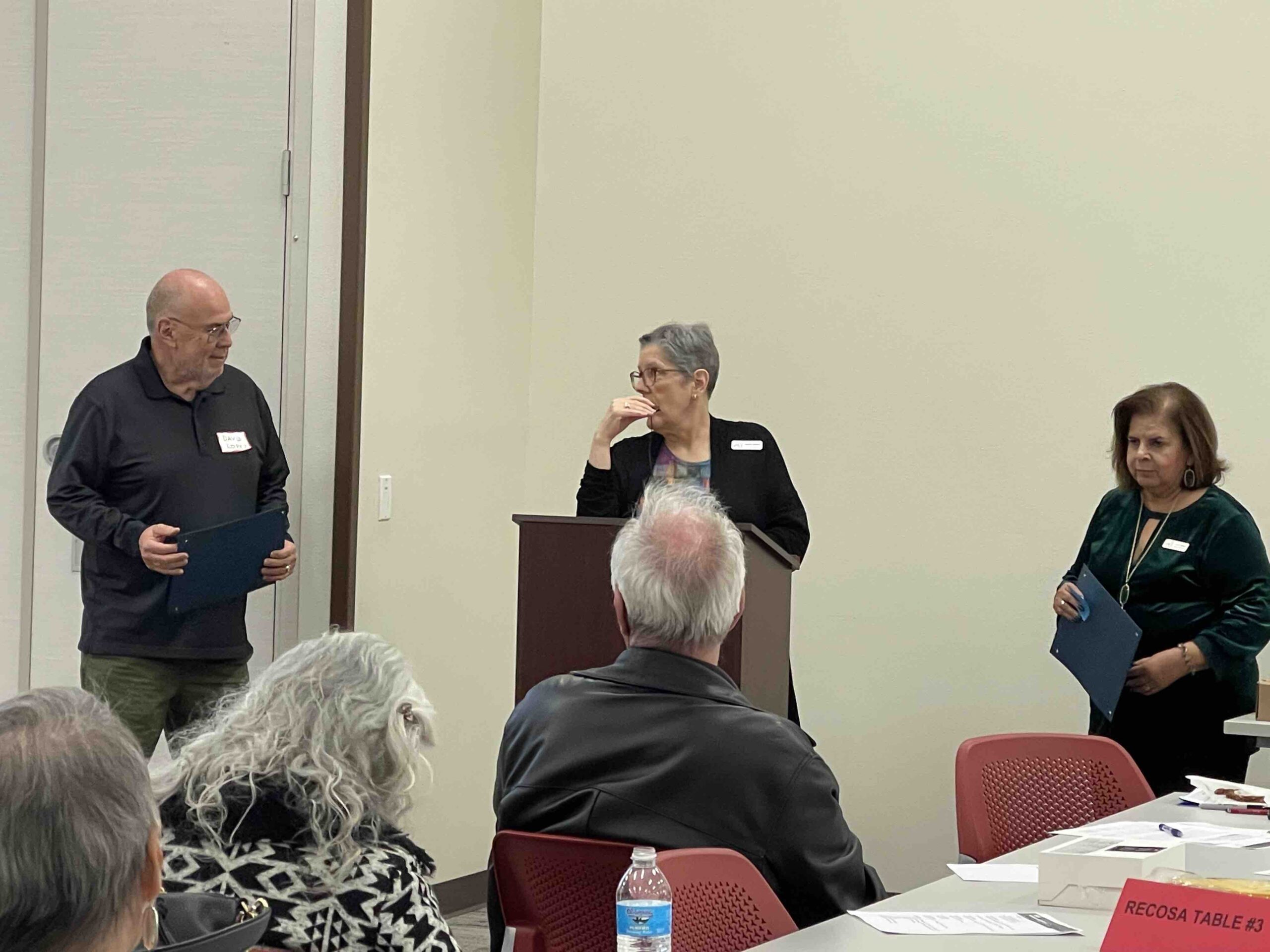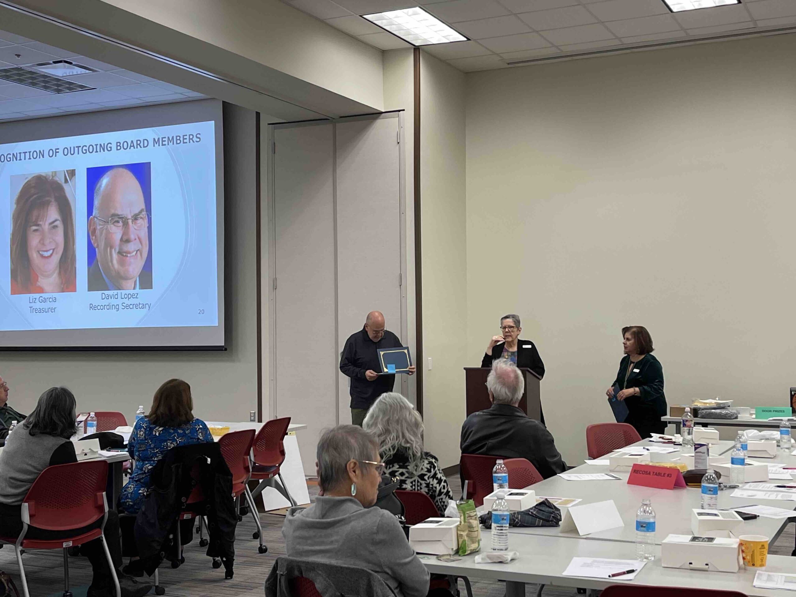 Becky Waldman (center) recognizes outgoing board members David Lopez (left) and Liz Garcia (right)