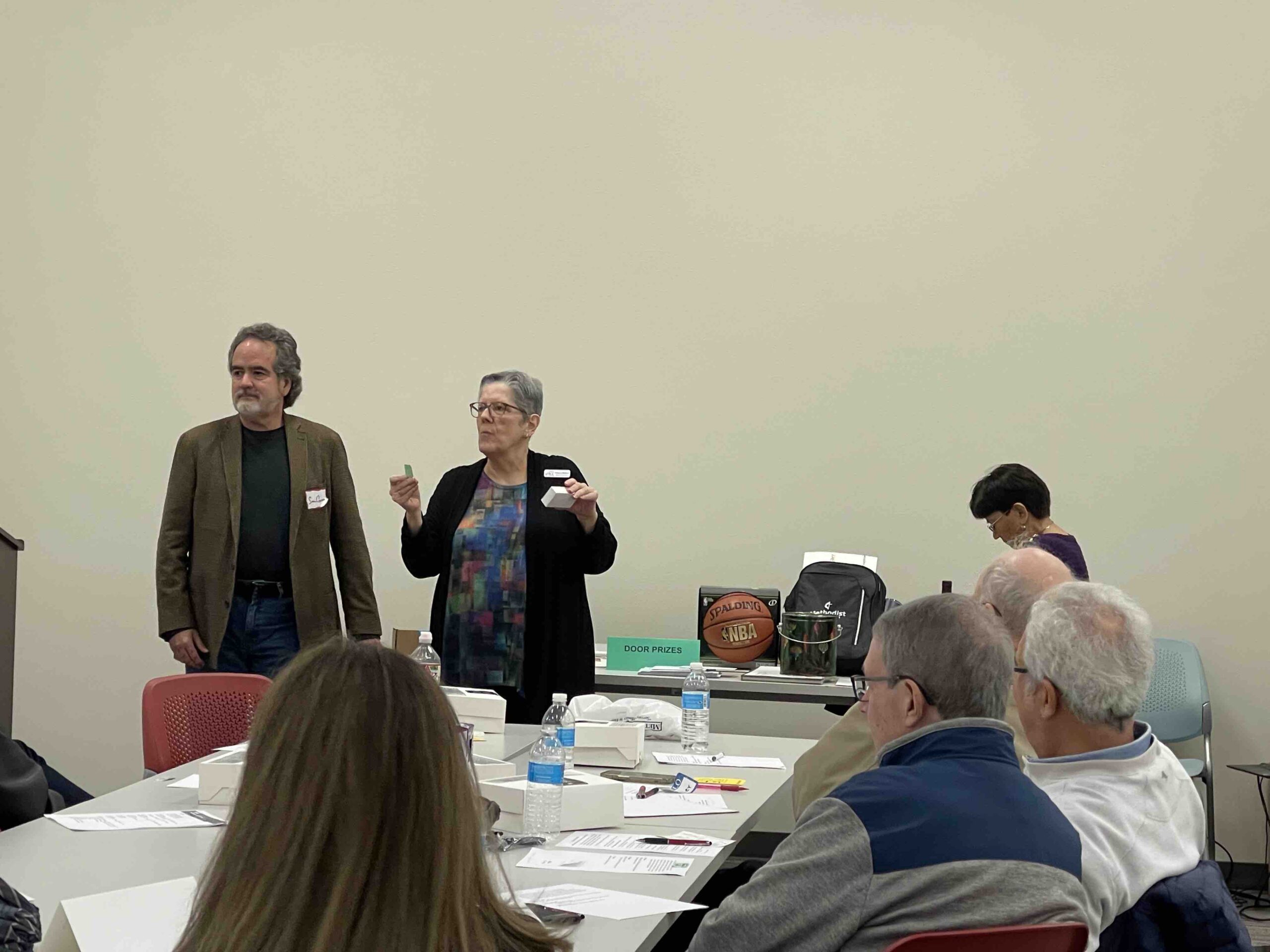 Becky Waldman (center) along with Sal Garza (left) and Diana Alcocer (right) give away door prizes